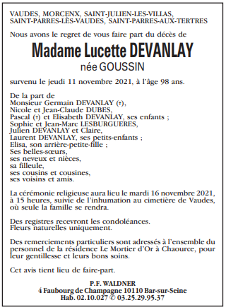Décédée à Chaource (10210, France) le jeudi 11 novembre 2021 à l'âge de 98 ans