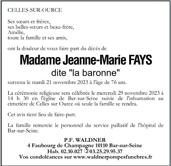 Décédée à Bar-sur-Seine (10110, France) le mardi 21 novembre 2023 à l'âge de 76 ans