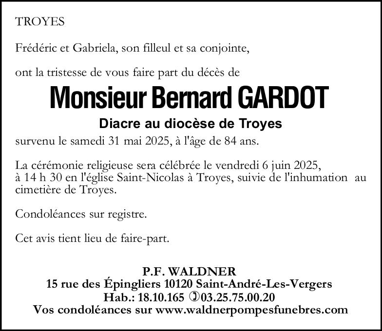 Décédé à Troyes (10000, France) le samedi 31 mai 2025 à l'âge de 84 ans