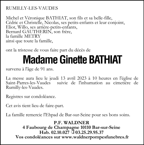Décédée à Troyes (10000, France) le lundi 10 avril 2023 à l'âge de 91 ans