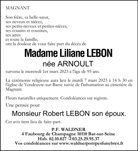 Madame Liliane LEBON née ARNOULT